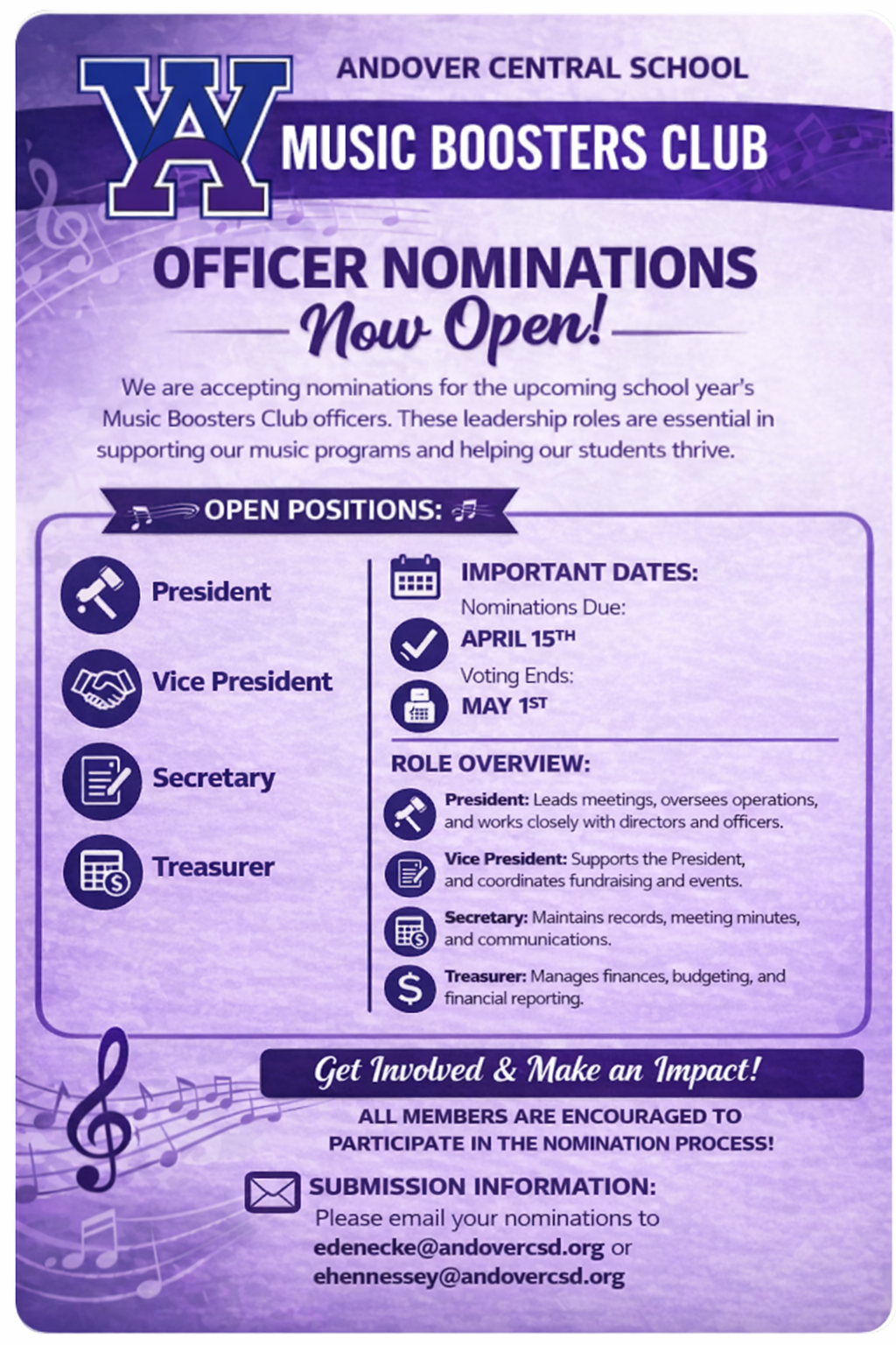 The Andover Music Boosters will be accepting nominations for officers until April 15th. If you or someone you know would be interested in helping organize a parent group that would benefit the acti...